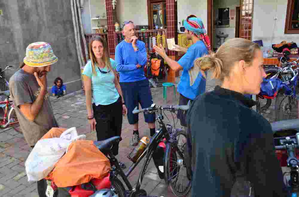 Sept 19, 2012 – Kashgar The best thing, for me, about Kashgar are the street markets in Old Kashgar, the Uyghur part of town. The winding streets are alive with vendors, often in clusters by product. The women dress in a wide variety of clothing, most frequently with bright multilayer dresses and head wear and high heels often with sparkles on them. Most women are not face covered, but many have a half cover or just the eyes showing and a small number have the full covering usually of a dark brown that must be hard to see through. Children on the way to school or just playing add a playful flavour. The people do not seem to mind our intrusion and will let us take pictures. I took Rich on a walk of some of my favourite areas and was shocked by the amount of re-building that seems to be going on in the old mud and straw warrens since I was here two years ago. But business goes on as it has for thousands of years. The men congregate in great numbers in the streets closest to the mosque. They stand in groups talking and sometimes bargaining often on carpets. No doubt most will wander into the mosque frequently to pray. We arrived here last night around dinner time. From the balcony of our third floor hostel we look out on Id Khan mosque, the largest in Kashgar. Our flights all went fine, but five flights, six airports and 36 hours on the move really do take a toll. Our bikes and luggage seemed to have handled the trip better that us. But a few days here and we will be fine. In addition to the street visiting, we cycled around looking for a bike mirror for Rich and talked to people at the other hostel and to John’ at his restaurant in the Seman hotel looking for information on the road ahead. We did pretty well at both places.Our best meal was the night we arrived at the Eden hotel where I stayed two years ago. The restaurant is upscale Turkish and has a great variety at good prices. Our meal tonight, in the commercial part of town was no where near as good. Our last night we will likely go to the Eden. Sept 20 – Kashgar After another leisurely morning we cycled to the big market and spent an hour of so wandering the labyrinth of shops. It is good people watching, although we left before it got busy. I had to have my front chain ring replaced, as it got bent in transit. My Dahon has really been through the mill on each of the three major trips it has carried me. We bought some food for the way out tomorrow and will eat a bed-room breakfast and get away shortly after sun-up. Tomorrow the KKH. Sept 21 – Police Checkpoint at Ghez We got ready to leave, eating as we prepared. We even had coffee, thanks to the ubiquitous Chinese thermos of hot water, always available everywhere you go. We were on the way at 8:30 Beijing time, which means it was still dawn. We had to ride to the end of the block, catch a main drag to a traffic circle then choose the right road out of five which would take us out of town. You have to accelerate to get into the traffic and cut across the lanes to make the correct turn. Rich was behind me going into the circle and I stopped after making our turn. He didn’t turn up.After a couple of minutes I rode back against the flow and looked into the only other road he may have taken. He wasn’t there and so I headed up that road as fast as I could go. To make a long story short, we didn’t connect. I rode back and forth up all the roads, circled the round-about a number of times and after close to an hour and 20 km I headed back to the hostel. He wasn’t there and hadn’t been back. I headed off hoping that I would catch up to him in a few hours. He had to be ahead of me.