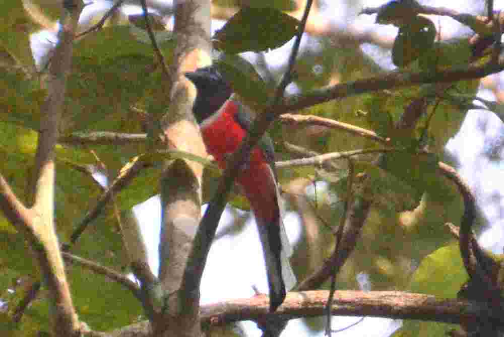 The day I arrived Gireesh called everyone, which included six Indian birders at the guesthouse doing a one day birding count, and John, a 65 yr old doctor from San Francisco, who is here for his second two week birding visit this year. We all followed Gireesh into the jungle adjoining the guesthouse as he had identified the call of a Malabar Trogon, one of the rare birds everyone was after. Sure enough, it was spotted high in the trees, and we got some fuzzy, over-zoomed photos.