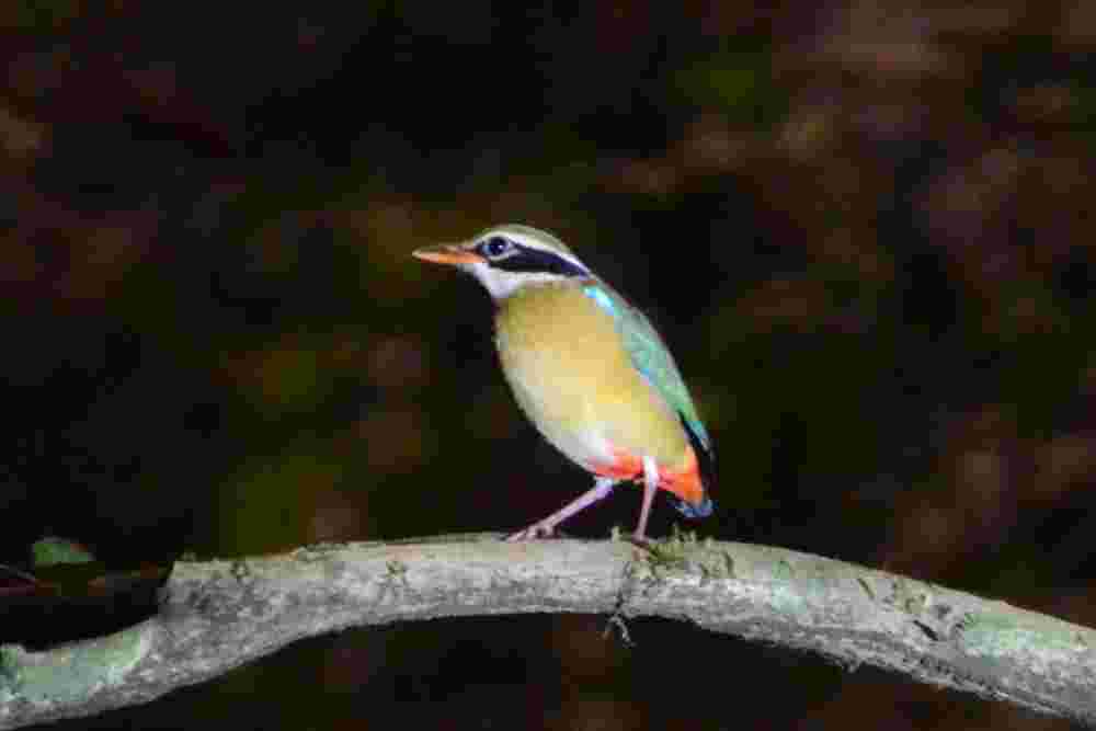 A final story on Thattehad illustrates the capability of a strong bird guide like Gireesh. Our final night as a group I wanted to see a Frog Mouth and John wanted to see an Indian Pita. We went out and as the dusk was beginning to settle around us Gireesh left us and headed into the deep undergrowth and came back requesting we follow him, but not to touch any of the brush. Two Frog mouths were sitting on a branch, the strangest birds I have ever seen. We got some photos under the light of Gireesh’s high powered flashlight. After walking about a bit more, it was now getting quite dark, Gireesh stopped and indicated that he had just heard a Pita. Playing two recorded Pita calls on his phone and making some himself we headed back up the trail and at a certain point we stopped while he continued to make his calls. Now we could all hear the answering calls, as the Pita got closer and closer. After about 20 minutes of this the little Indian Pita, the cover bird on the Birds of India Guide, jumped up on a branch, and with flashlight illumination let us all take our photos.