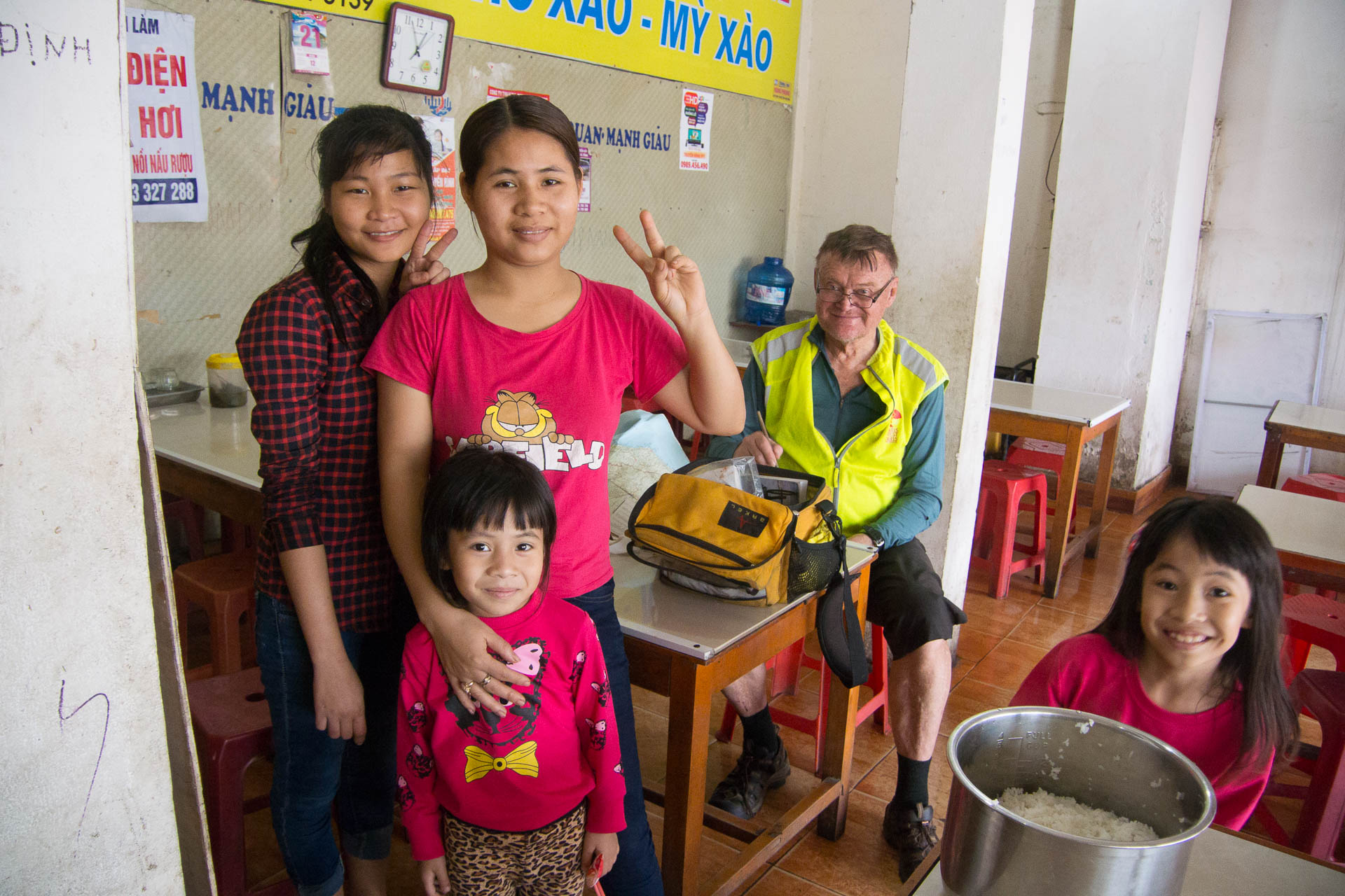 At my second drink stop I joined four young people who were waiting for an event to begin.  They were dressed quite nicely and seemed more like city kids, possibly from Vinh.  We had the normal questions.  How old, how tall, where from and so on.  One of the gorgeous young women had to have a picture of us snuggling.  Possibly she has a beauty and the beast interest.  I am sure she had to rush right home to wash my sweat off her impeccable outfit.