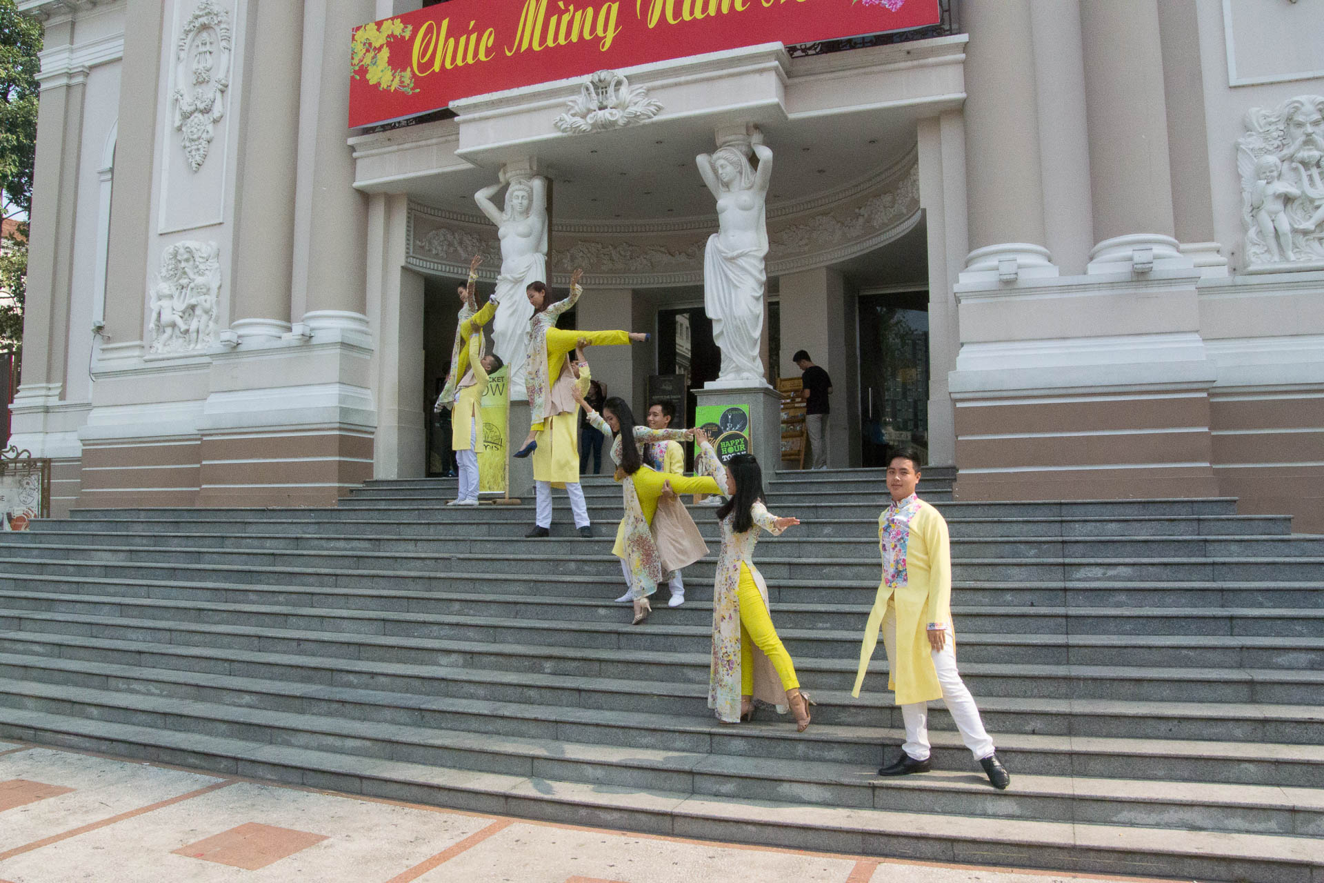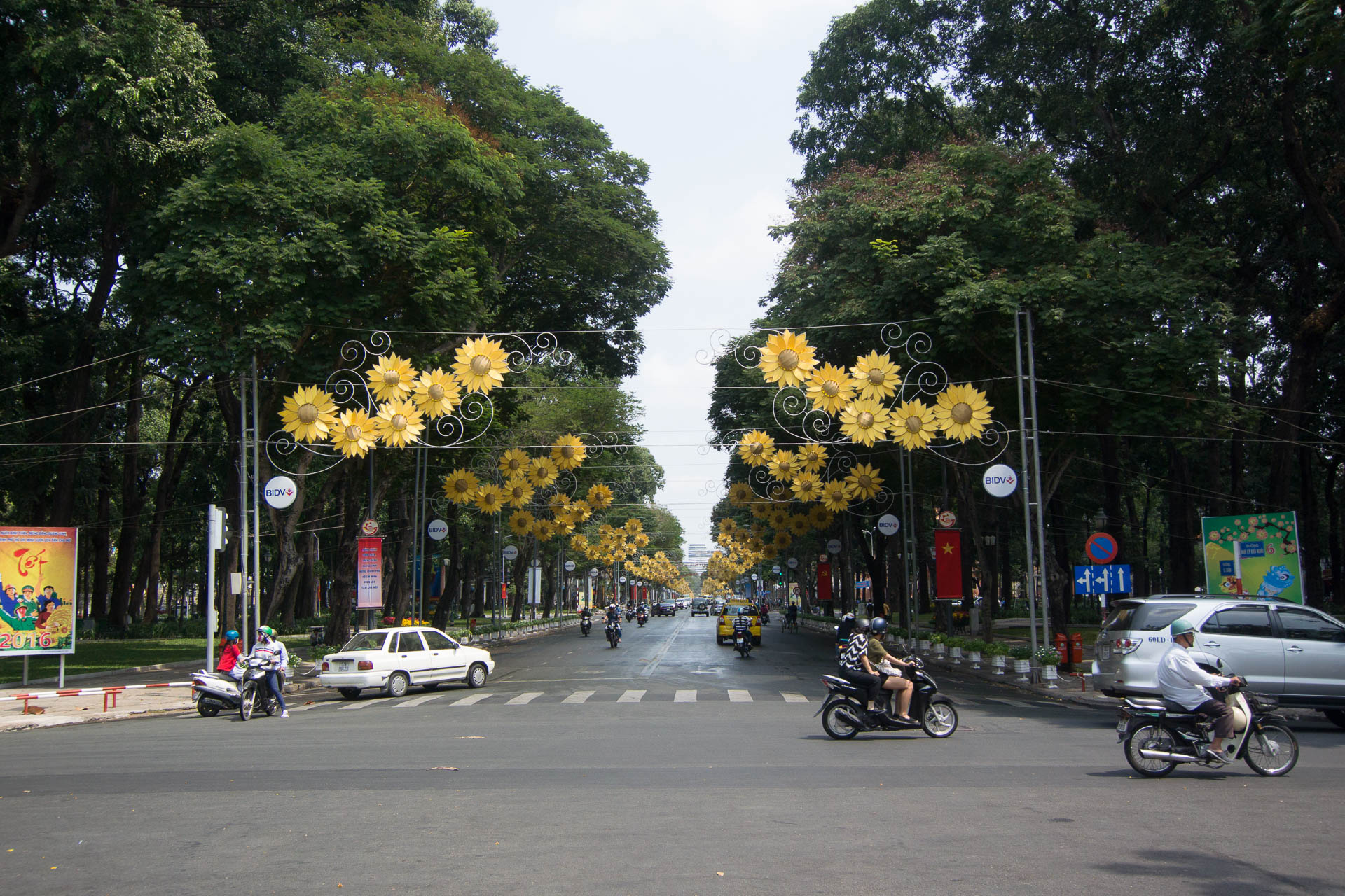 French 19th century architecture around the city melds in with the big modern hotel and office towers. Many of the streets are wide boulevards, decorated for Tet. Walking the streets was my primary activity in part due to the shade from the tall buildings and trees. I could choose between streets with modern office activity or street level vendors. Things were not too hectic and sidewalks usually had enough space so that people could walk on them, even if you did have to watch for the odd motorbike avoiding a congested street.