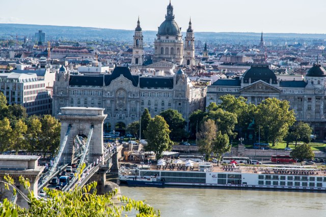 Coming down the Danube a dramatic view of Budapest first unfolds from the Buda looking across the river to Pest and the Parliament buildings.