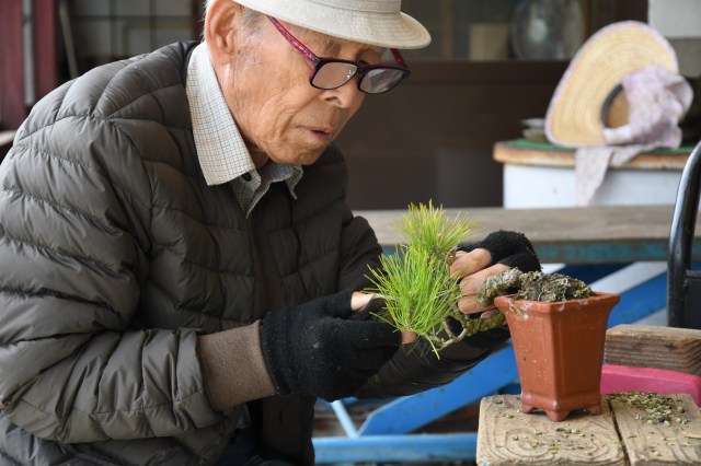 I connected with Peter at 81 just after he tripped on a chain across a road that he didn’t notice. He scraped his knees and nose and loosened a bridge. I guess I’m not the only one doing these things. There was a nice long trail down off the plateau leading onto the back streets below. I went through an area where they were making bonzai trees and watched an ancient man setting up to begin work.