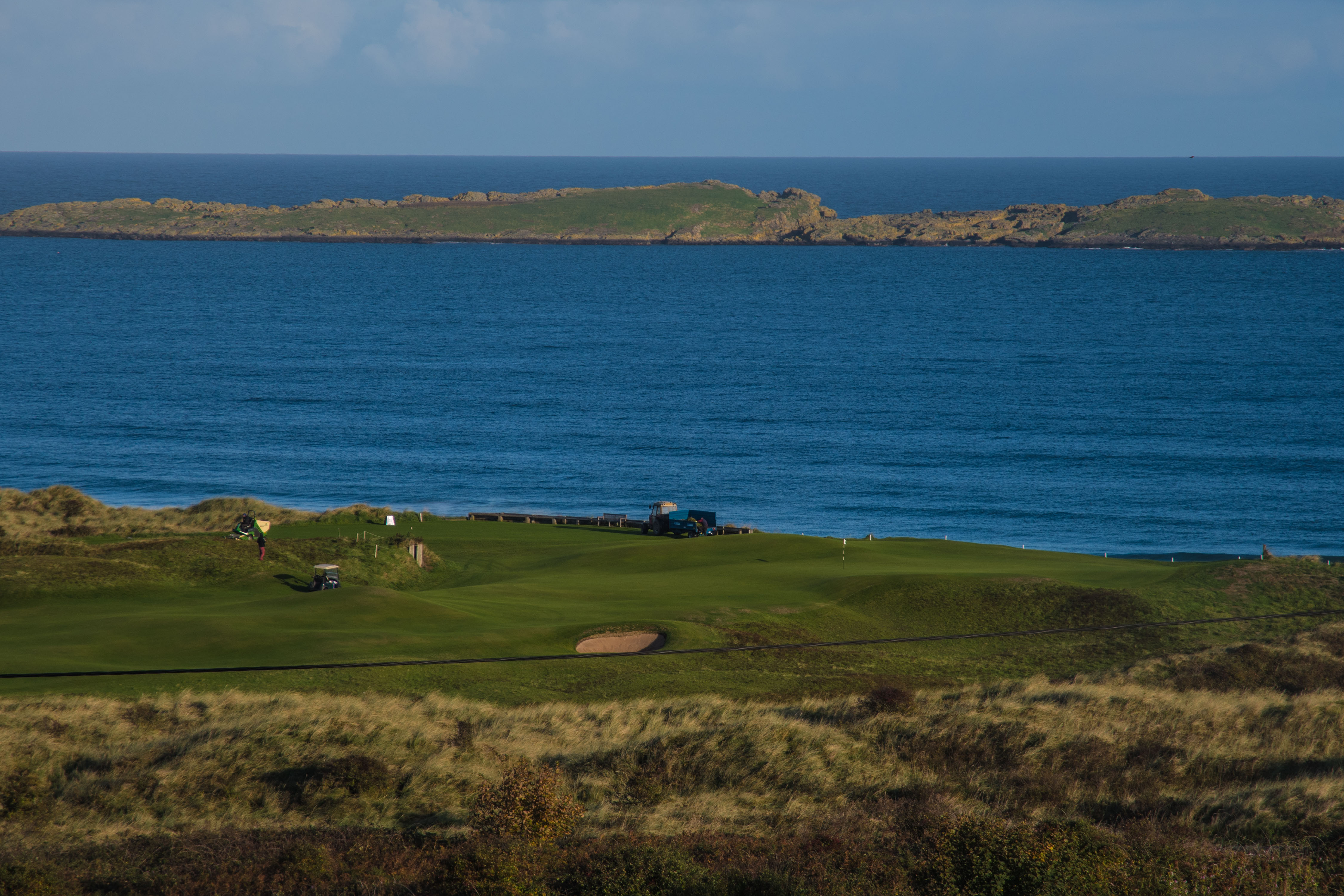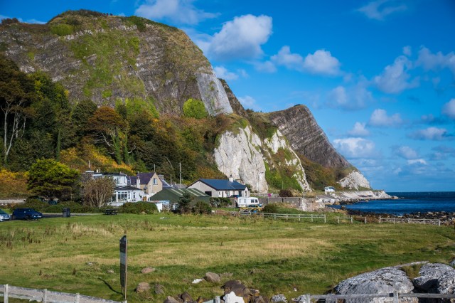 I was barely out of Portrush when I stopped first to have a look at the Royal Portrush Golf Course.  I had read that summer fees are 190L (pounds), dropping to 100 in Oct and 60 in Nov.  It is the site of the 2019 British Open.  A links style course running along the white sand beach. I couldn’t see much, but it looked immaculate.  There were already golfers out, dressed in their winter garb.
