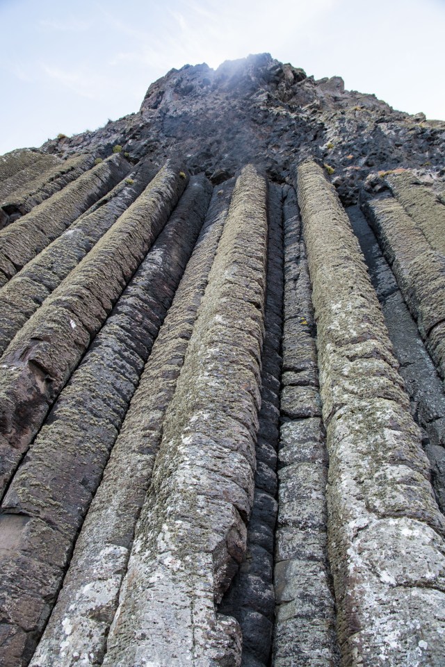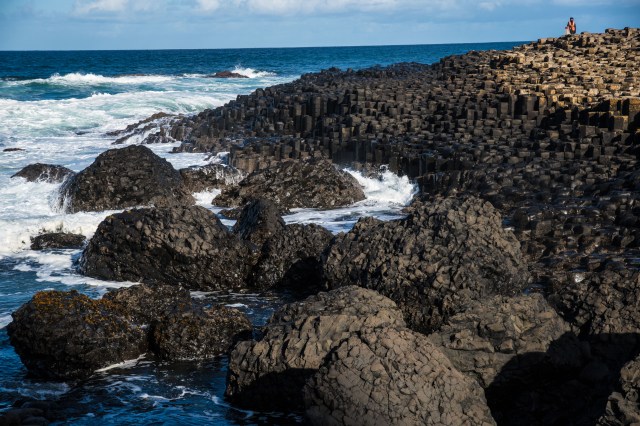 So, on to the Giant’s Causeway.  I spent about two hours walking along the trails to the different areas where the polygonal basalt columns are found.  I had been to two similar locations with these kinds of formations: On the John Muir Trail in California and at Svartifoss in Iceland.   There are many places around the world where they occur.  They are formed when water pours into molten lava with certain characteristics.  But the story here is different.  They were formed here by a Giant, Finn McCool who was making a pathway to Scotland to take on another Giant over there.  When he saw how big the Scot Giant was he beat a hasty retreat and destroyed most of the Causeway.  I may not have the whole story but it seems plausible..