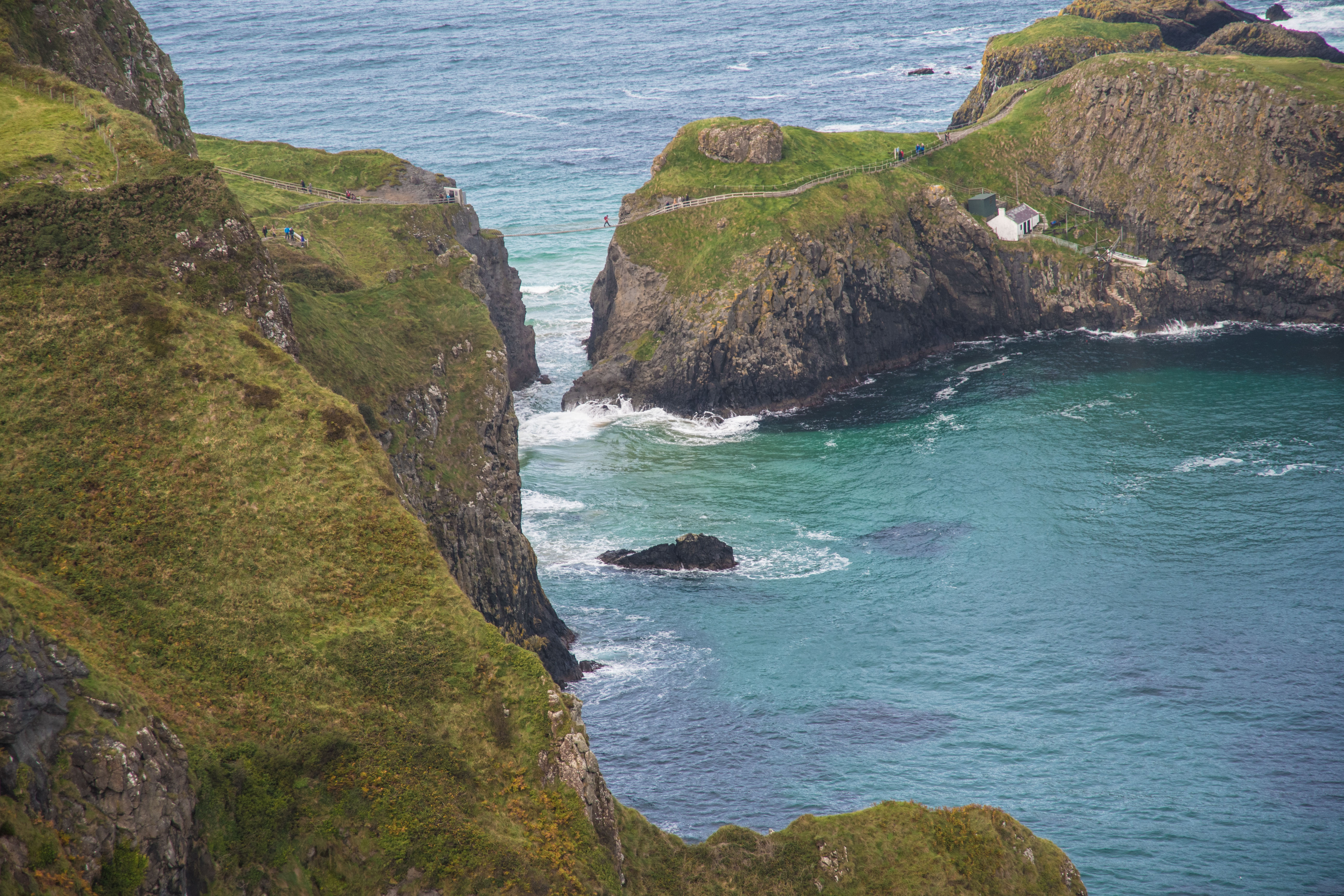 I had a steak and kidney pie early in the afternoon at Ballintoy and then stopped occasionally to take pictures of the sea coast and then again at an overview of Carrick-a-Rede Rope Bridge.  For 7.5L you can walk across this bridge to prove how brave you are.  I had already paid 10L for parking and entry to Giants Causeway when I didn’t have a car and where the walk doesn’t actually cost anything, thus proving I am not very bright.  I also decided that riding a bike on busy highways is enough of a bravery test for me, I didn’t need another.