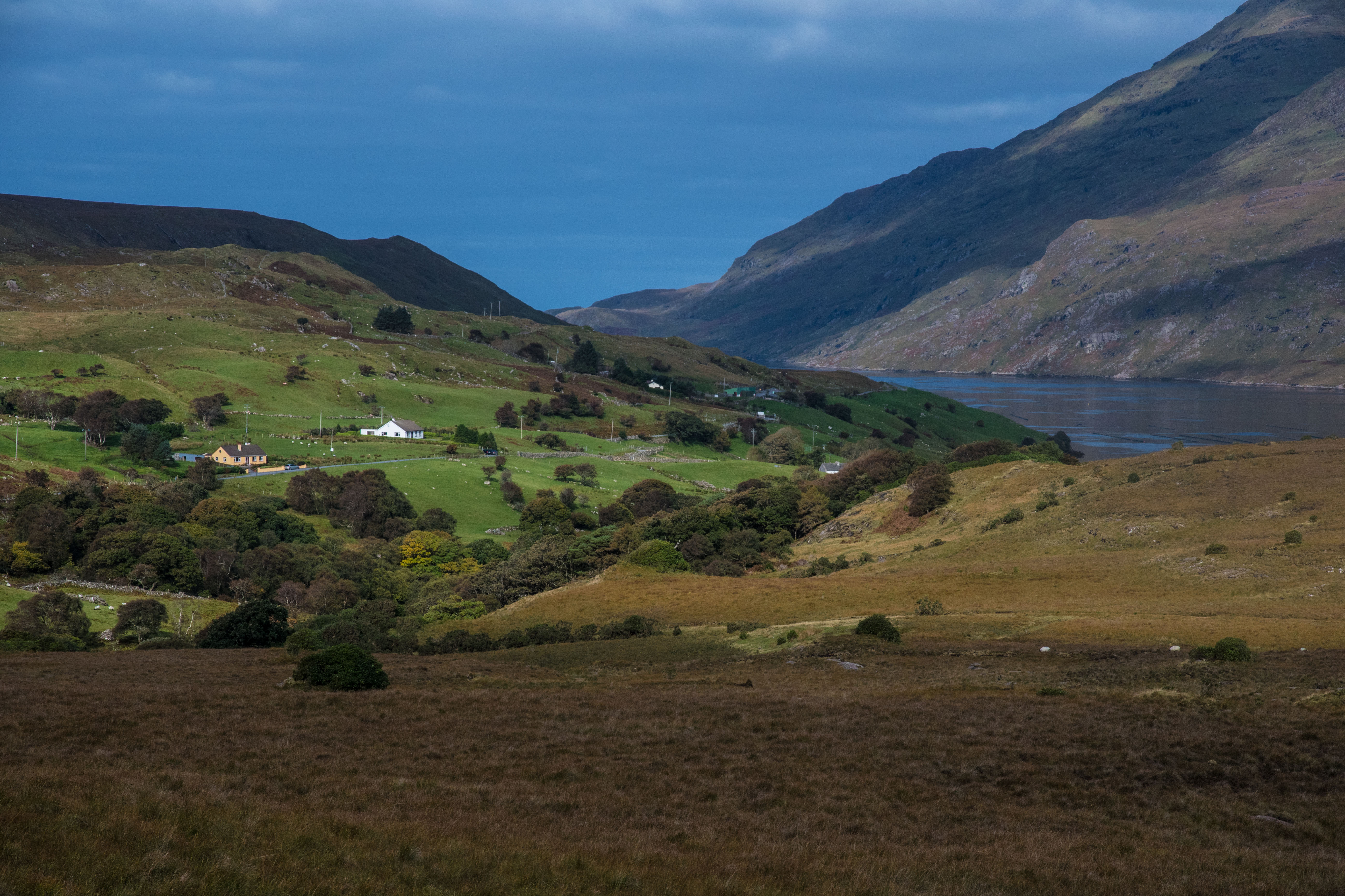 Cold and pretty clear as I climbed the hill heading out of Clifden, near the outer-end of Connemara. The hostel hostess had made a full breakfast for me, much beyond the normal continental style offered in most hostels.  Like the road into Connemara from Galway yesterday there were quite a few lakes and even more hills, as I would spend the day riding north through and eventually out of Connemara.  With the clear skies I was able to take a few pictures.  The hills are quite barren of trees, much the same as I have seen whenever close to the sea on the west side of Ireland.  But they still have their beauty and beckon the walker in me.  But I am headed north, still under the notion that I have to keep going while the weather permits.