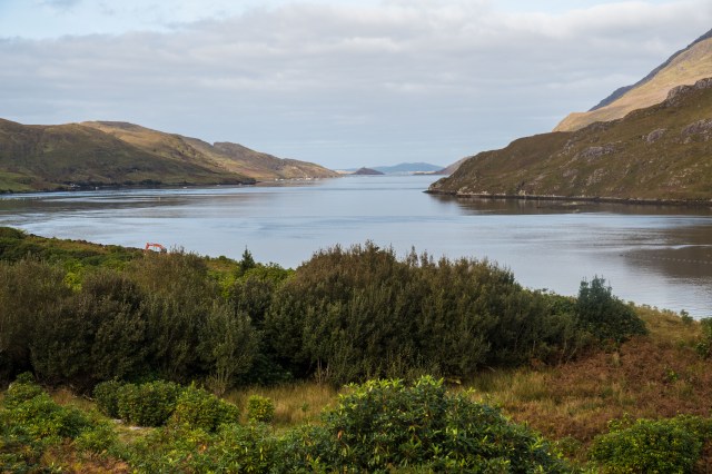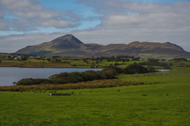 The road dropped from the hills down to a long fjord where I stopped in Leenane for soup and bread.  I had an option here to take a quieter road through the mountains, but as it would more than double my remaining riding for the day I gave it a miss.  The road I chose rose steadily from the fjord to a high flat area again; and it wasn’t very busy anyways.  As I was approaching the end of the day I noticed a high bald peak with a predominant trail leading up to its summit.  In town I would confirm that this is Croagh Patrick.  In less windy times or when I was more moved to take a day off rather than moving on I would be stopping to do this pilgrimage to celebrate Ireland’s Patron Saint.
