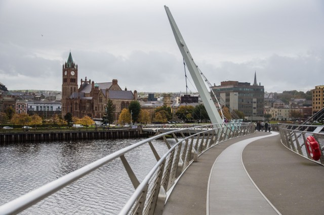 I came into Derry (Londonderry) along the River Foyle, which becomes a tidal estuary as it enters the city.  It is quite wide and the first thing of note as I approached the centre of the city was a new meandering foot bridge called the Peace Bridge.  I had pushed quite hard on this day not real certain how far I had to go and I noted that it was only 1:15.  So again I had coffee and a treat for a while and then phoned the hostel and the young guy running it gracefully agreed to let me in early.