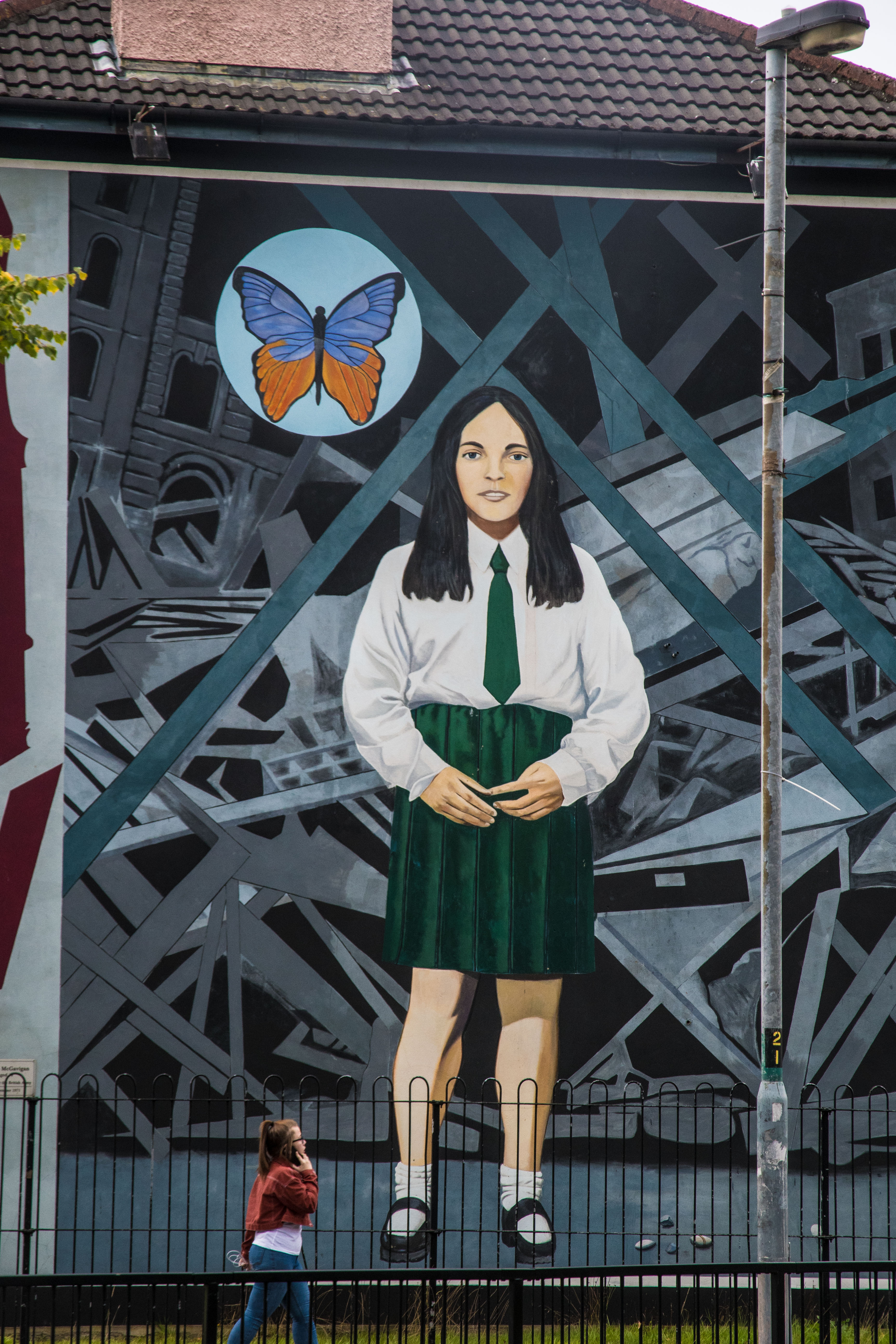 There is still a non-violent resistance to the British in parts of Northern Ireland and some of that resides in Derry.  To begin with there is an on-going issue about the name.  London was added to the Derry some two hundred years ago by the British occupiers.  In road signage the London part will often be scratched out.  I was most interested in a district called Bogside.  At one time this was where the poor Catholics lived and it became the centre of the resistance.  There are about twenty paintings on buildings reflecting the struggles.  They were initially done during “the Troubles” as they were called.  The British army would remove them and they would reappear.  Today they represent a history of that period.  A critical period was about 1971 when people were killed in the streets and some of the murals represent those events.  One painful one is the painting of a 14 year old girl who was out with friends collecting things for a school project when she was shot.  The painting has a butterfly symbolizing the need for peace and at her feet were a few small stones which she had collected for her project.