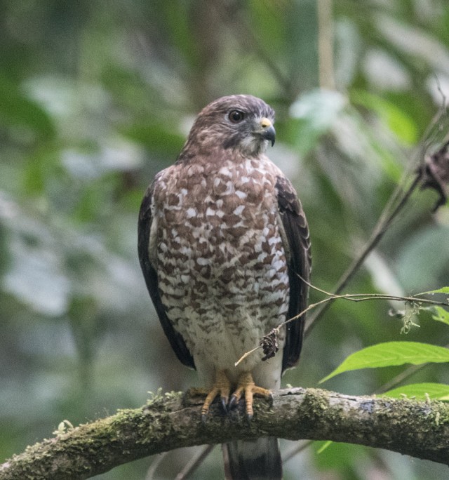 We hung out at the feeders and wandered the grounds for a while until Yesennia returned from an outing and then we created a plan with her for the next two days. The first day after breakfast in the lodge at 5:30, we walked and birded for about five hours up the road until a hot lunch was brought by motor bike. We then turned around and birded back to the lodge again. The second day we drove for about an hour to the top of the mountain, at about 2400 m, where there is a military base protecting the communication towers. We watched a different slate of hummingbirds at the feeders there. The lodge maintains feeders at various locations along the road to the mountain top. At the top we also saw new tanagers in the bushes and a swallow-tailed kite soaring on the early morning thermals. Hot breakfast was served on the truck tailgate. We spent the rest of the day walking and birding our way back down the mountain, with a hot lunch brought again by motor bike. Weather varies continuously. First hot sun and then clouds made birding tough.