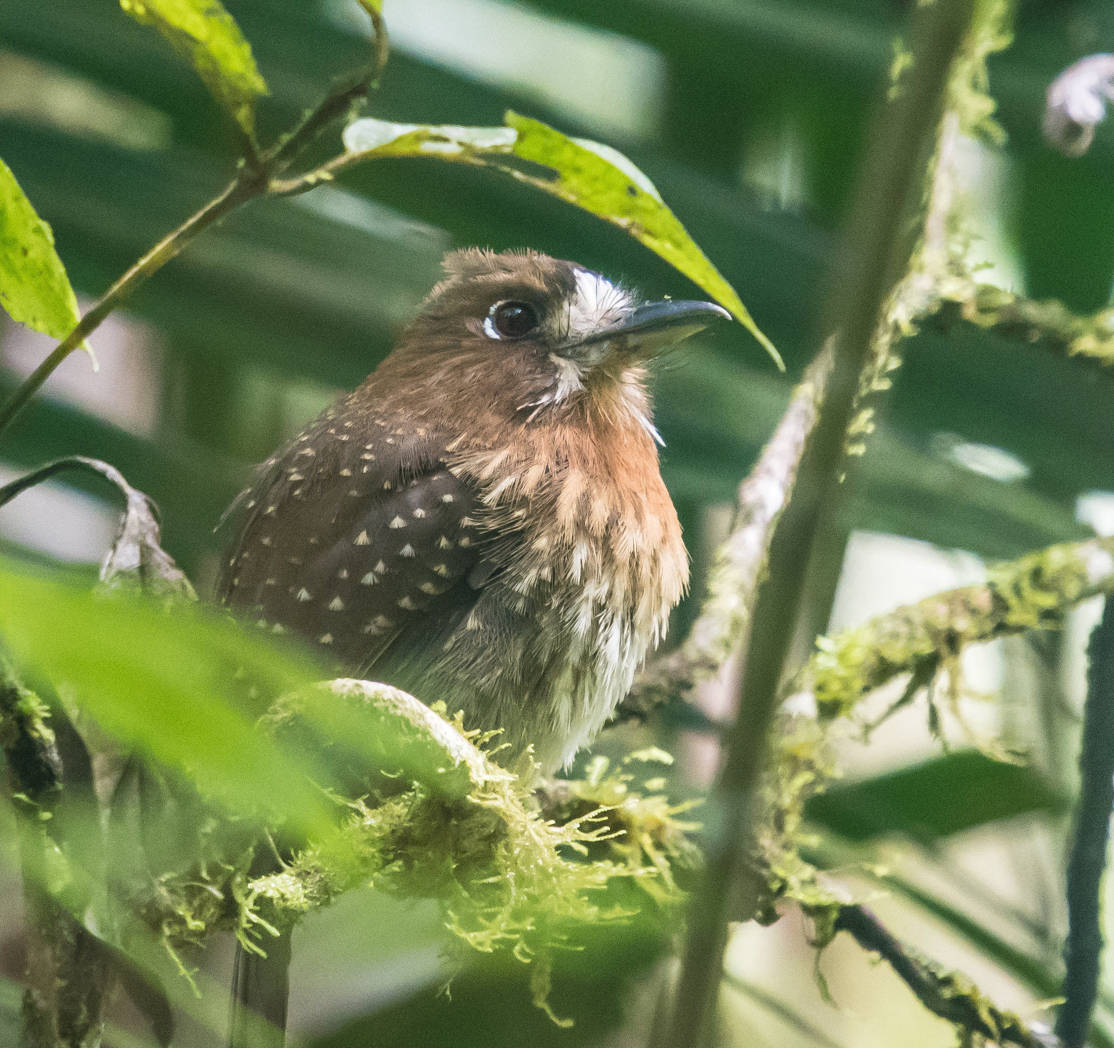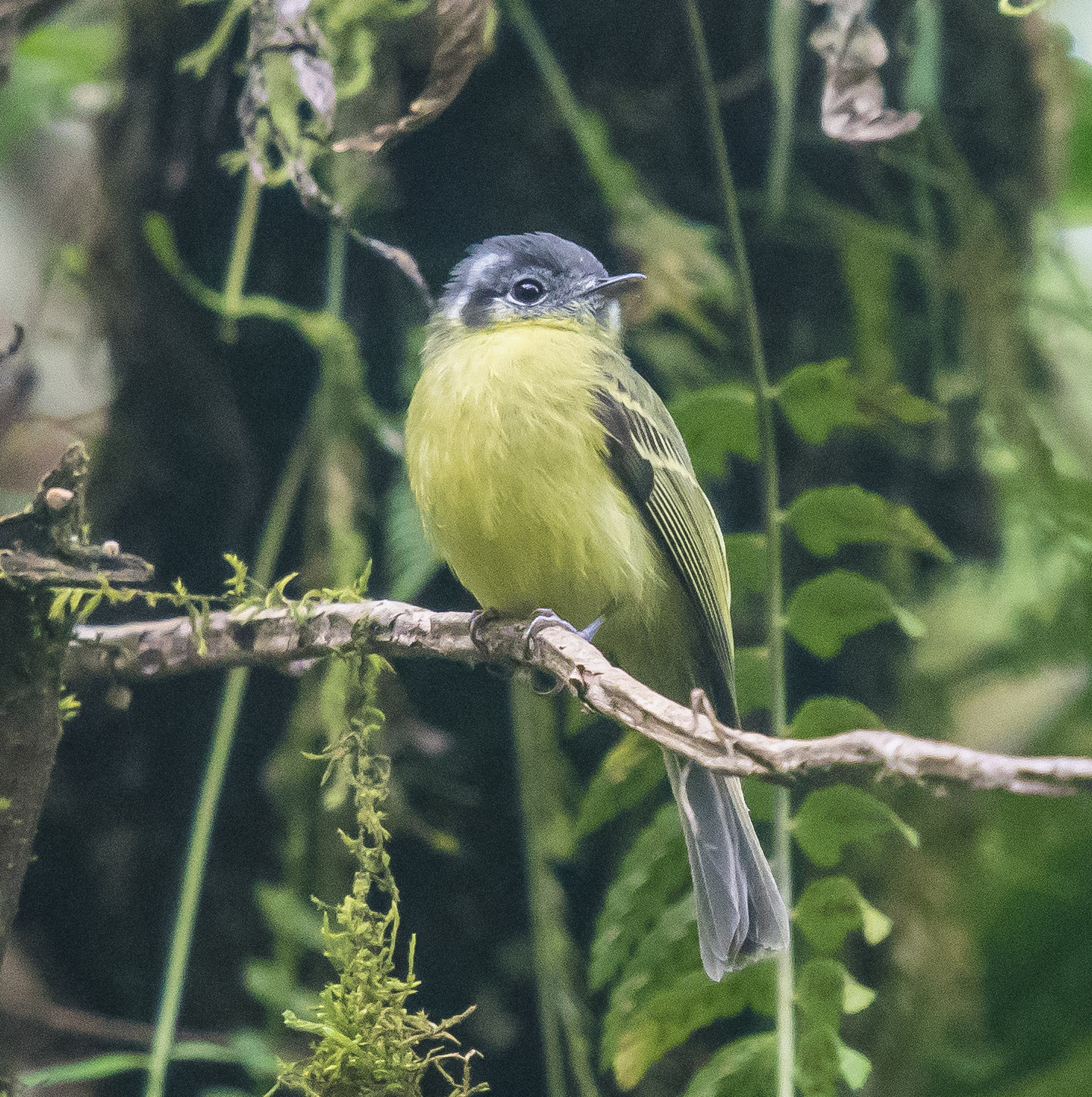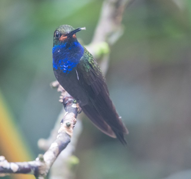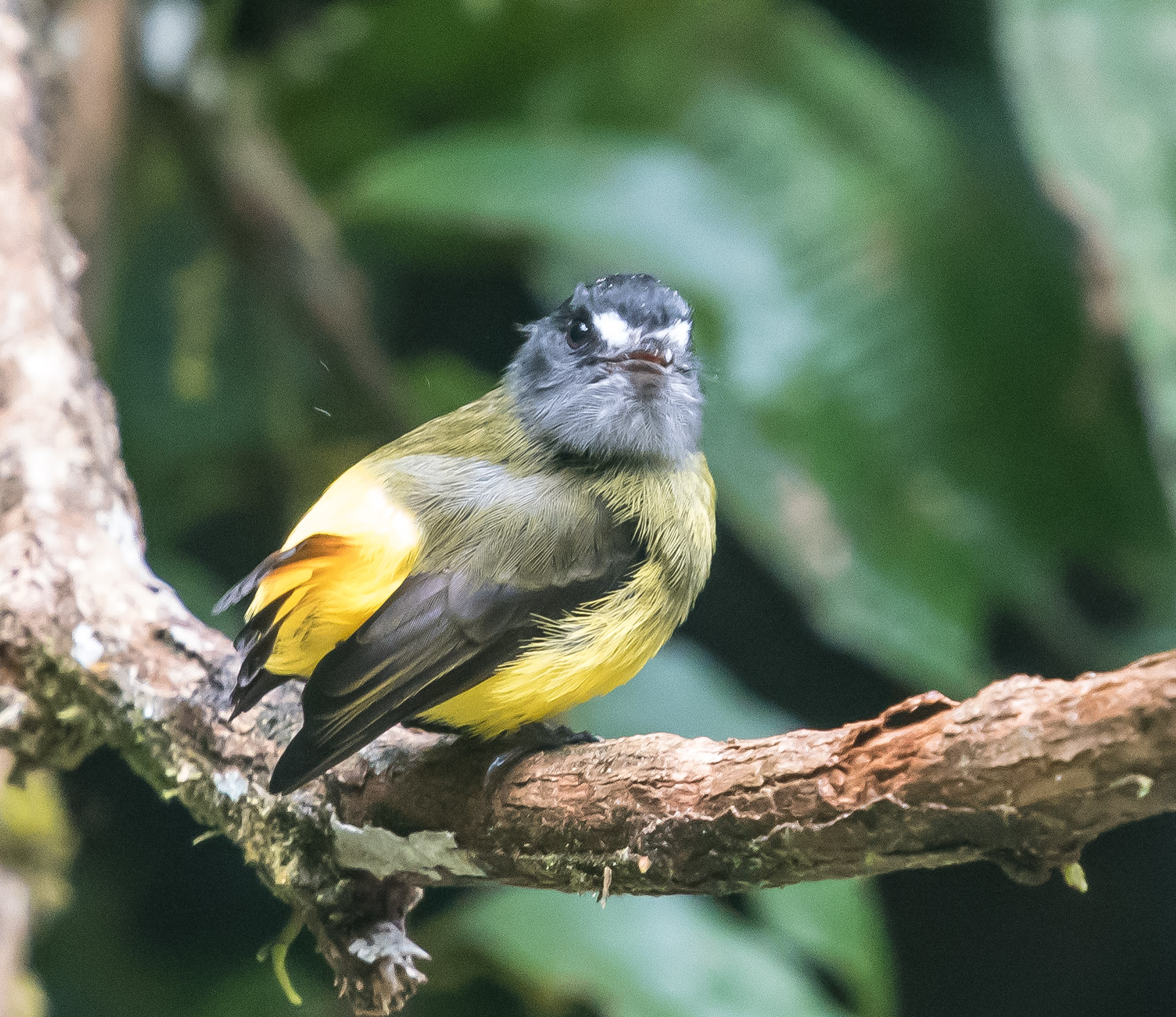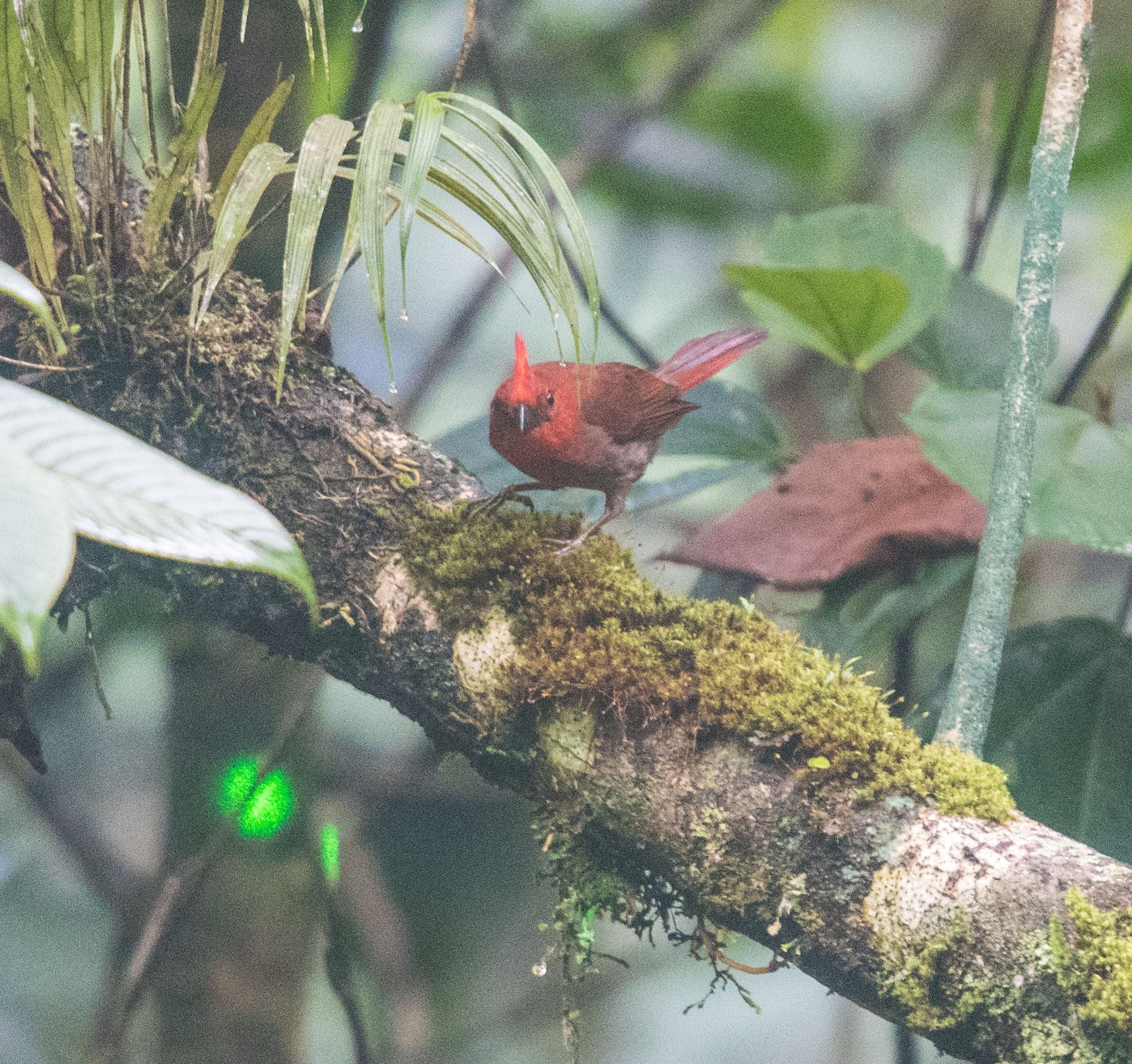 Birding, and for me bird photography, in the cloud forest is very difficult. It is dark jungle, the birds are mostly small and very shy and rarely sit out on exposed branches. The guide, in this case Ysennia, will know all the birds by sound and what their behaviours and habitats are. Yesennia would identify a bird initially by sound and then with her binoculars. She would point out the bird by shining a laser pointer near the bird (never right at the bird). It was almost always sitting in deep shade amongst the leaves and branches. Rich would usually find it in his binoculars before I could get my camera locked onto it. Often it would flit off before I could get it, or it would be too dark or distant to get a good photo. To help zero in on a bird Yesennia, and the other bird guides would occasionally use recorded sounds to attract the bird closer. Sometimes this technique would be used by the guide in a location that they knew was frequented by a specific bird and the recorded songs would sometimes bring it in so we could see it. This technique is considered questionable by some and is not allowed in the national parks.