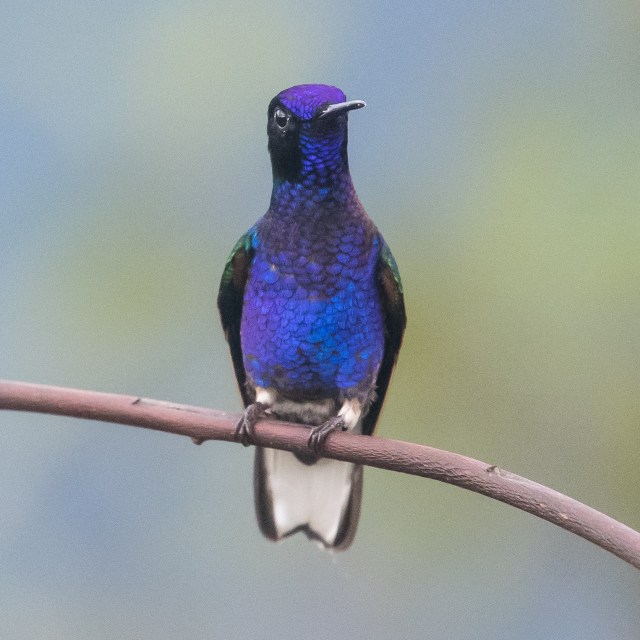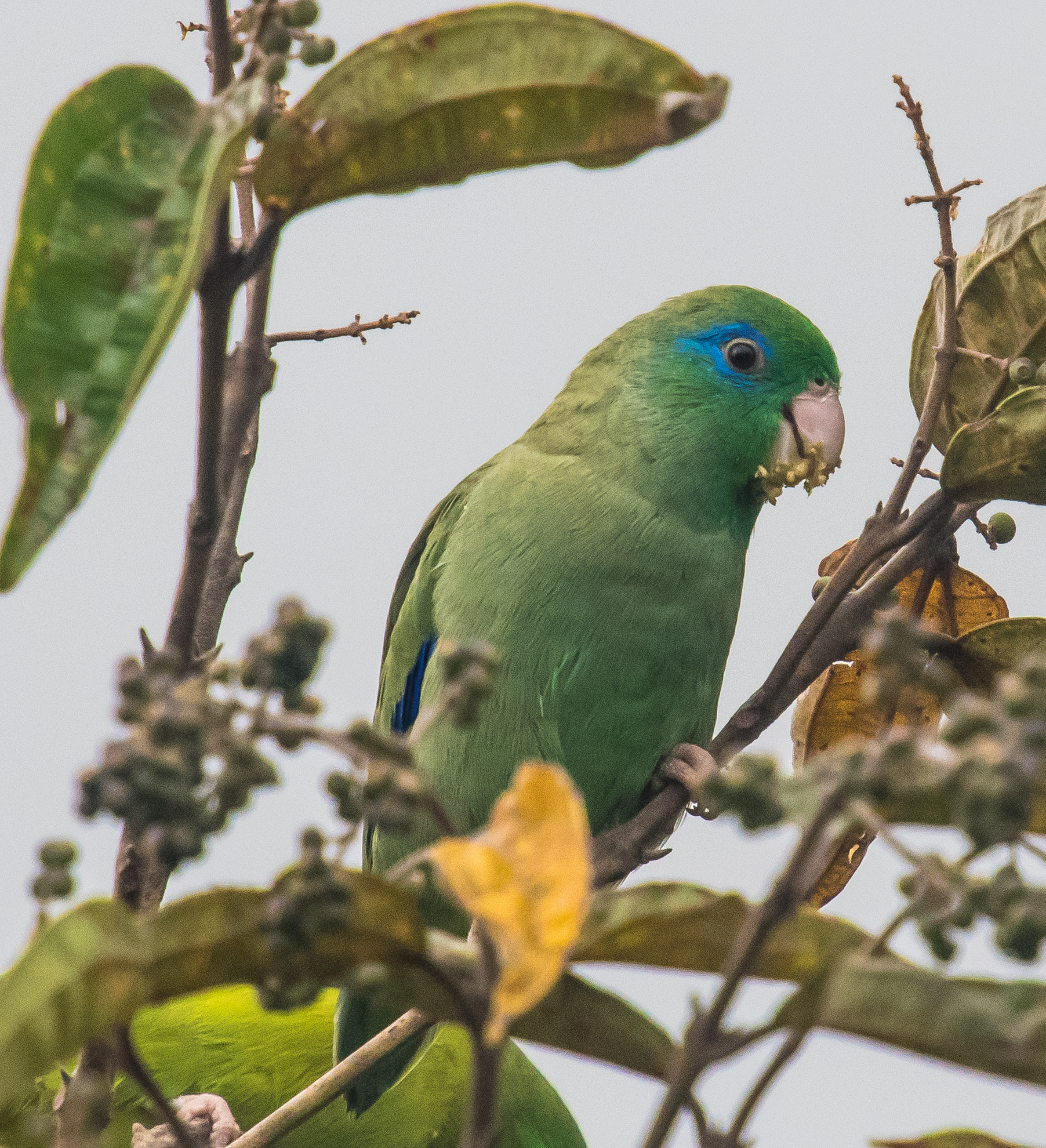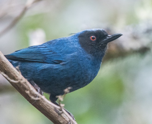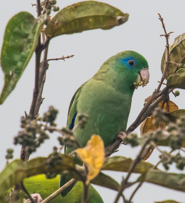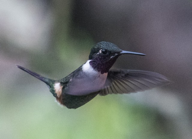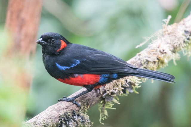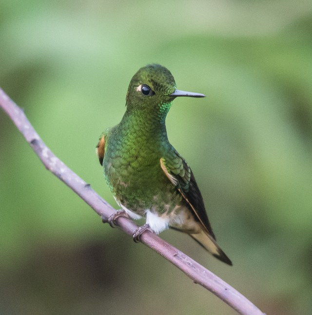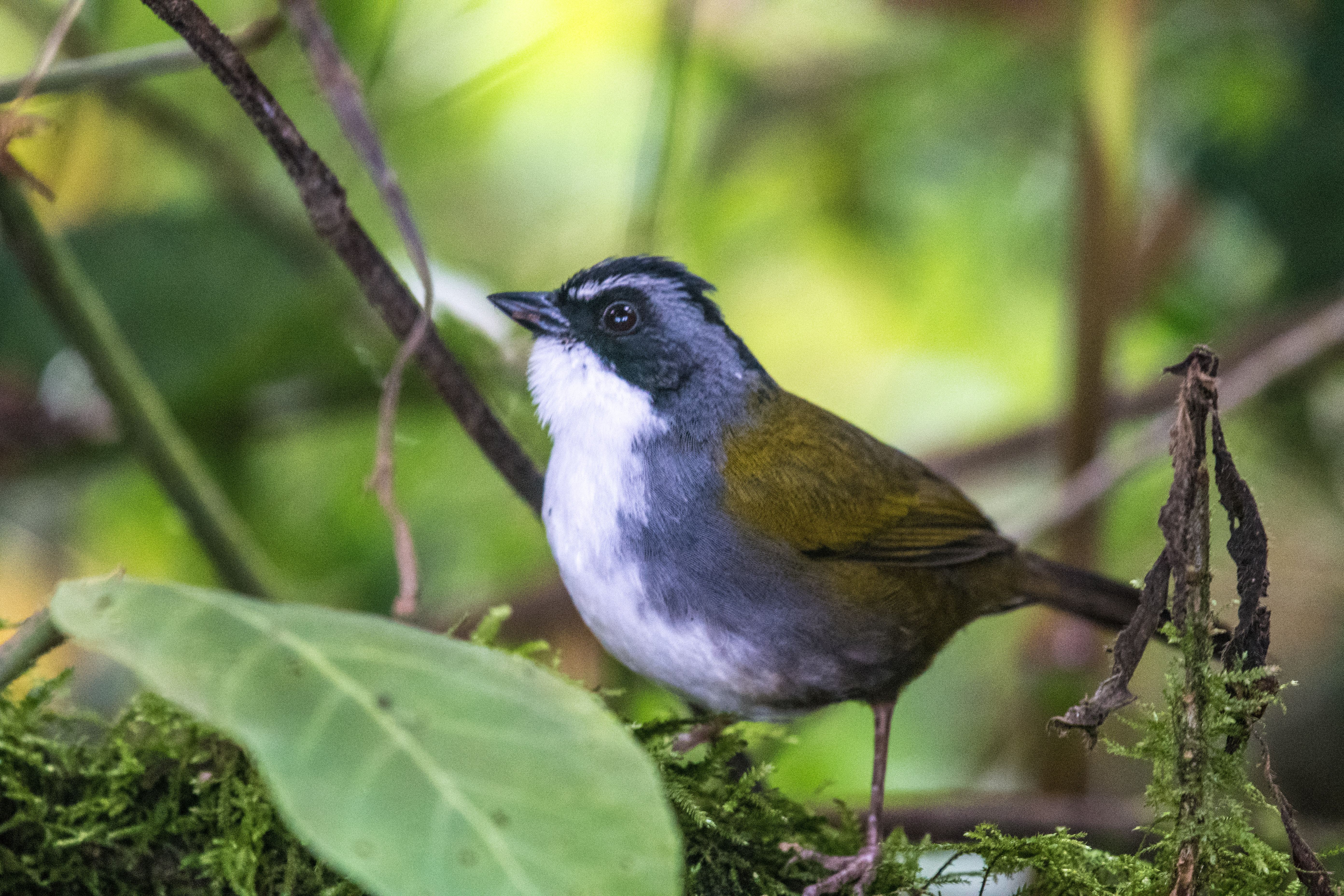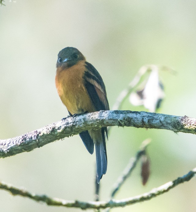 Birding, and for me bird photography, in the cloud forest is very difficult. It is dark jungle, the birds are mostly small and very shy and rarely sit out on exposed branches. The guide, in this case Ysennia, will know all the birds by sound and what their behaviours and habitats are. Yesennia would identify a bird initially by sound and then with her binoculars. She would point out the bird by shining a laser pointer near the bird (never right at the bird). It was almost always sitting in deep shade amongst the leaves and branches. Rich would usually find it in his binoculars before I could get my camera locked onto it. Often it would flit off before I could get it, or it would be too dark or distant to get a good photo. To help zero in on a bird Yesennia, and the other bird guides would occasionally use recorded sounds to attract the bird closer. Sometimes this technique would be used by the guide in a location that they knew was frequented by a specific bird and the recorded songs would sometimes bring it in so we could see it. This technique is considered questionable by some and is not allowed in the national parks.