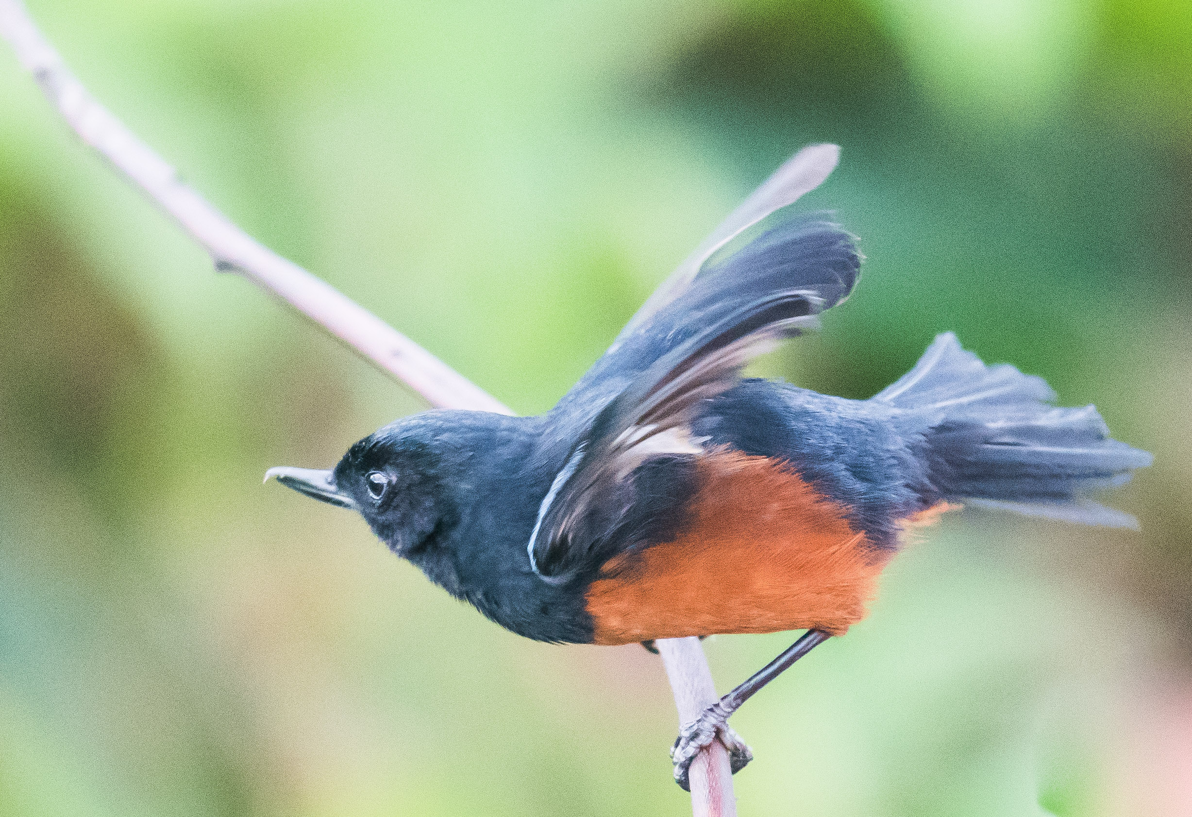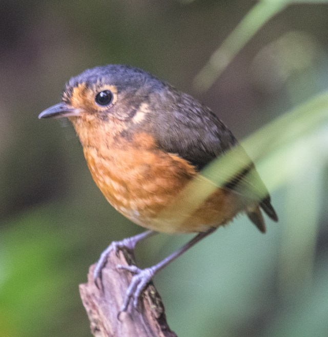 A key feature at Rio Blanco were the little hides that had been built where the guides have habituated some of the special little birds to watchers. The trick is that they throw little bits of worm onto a flattened area in front of where some stools for the watchers sit. After a while the little birds hop out of the dense undergrowth. We spent the morning walking up the road stopping at three of these hides.