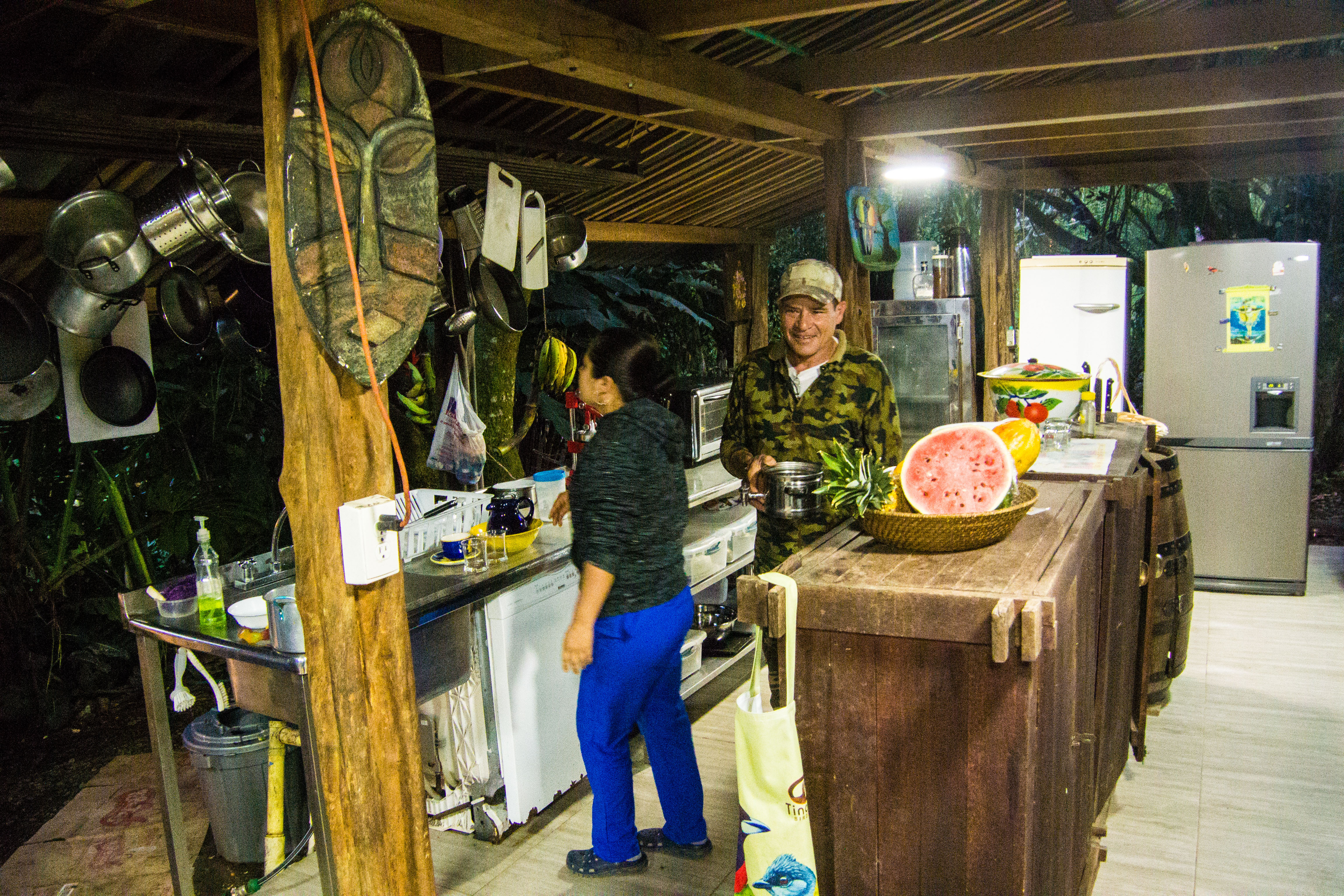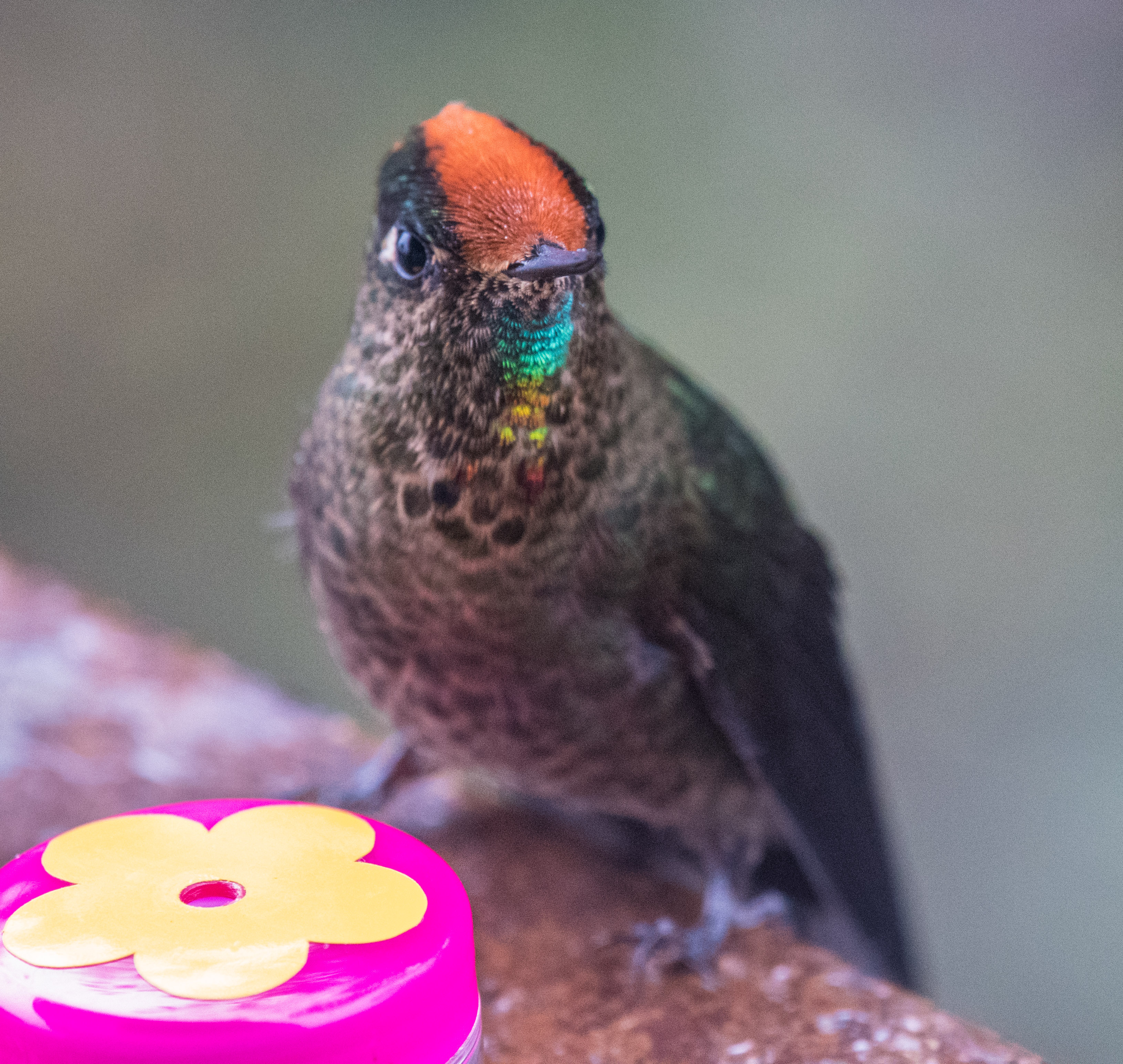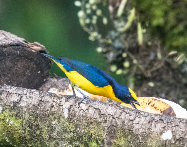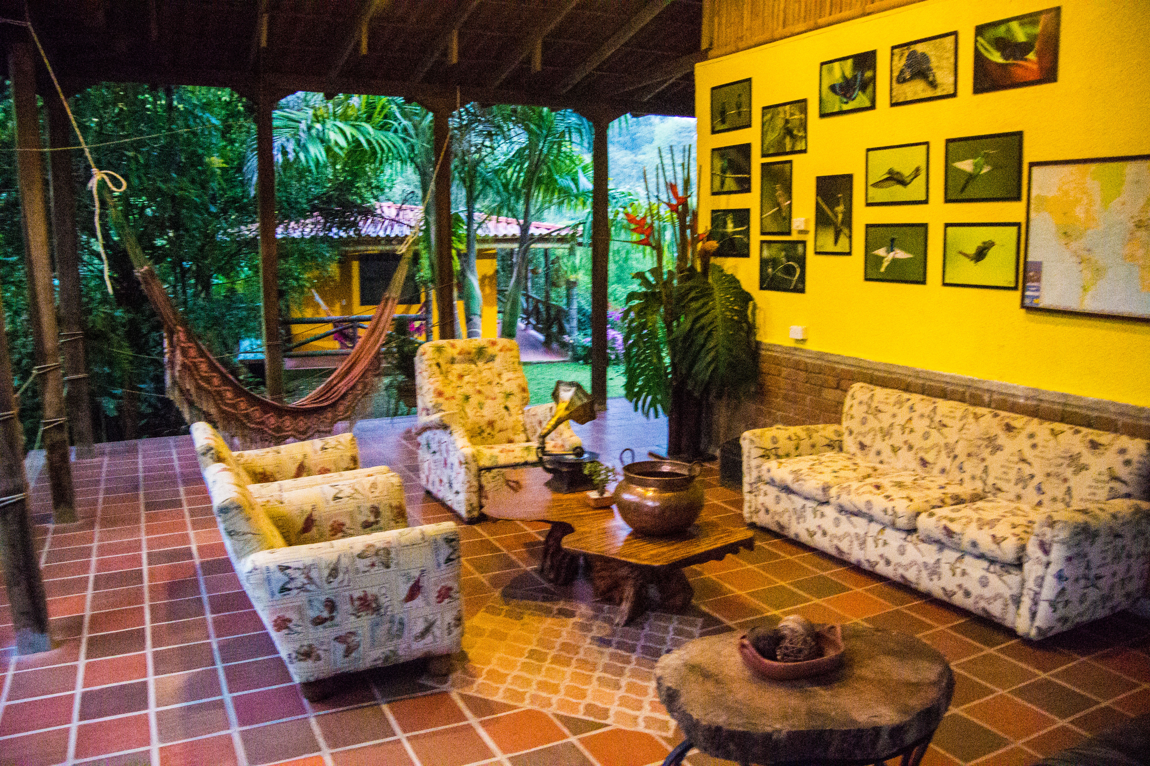 The lodge is a rough tumble of guest rooms linked by an open area that serves as the gathering place, the eating area, resource centre, discussion area for the guides and clients to discuss their plans and to build the birds-seen lists that are so important to everyone who comes. But primarily this area, is where you sit and watch the feeders. Coffee cup or beer bottle in one hand and binoculars in the other everyone will spend some hours catching the hummingbirds at the sugar water feeders or the tanagers and others at the hollowed logs holding mostly bananas. We got out of the 4×4 and headed straight across to the birds. Even before sitting down to the welcome lunch. Every group that arrived had the same reaction.