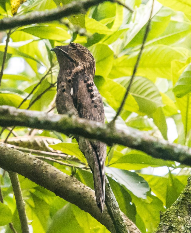 Francisco, the main bird guide at Tinamu does not speak any English but they contract, at a small extra cost, Daniel a younger guide who would spend the day with Rich and me. We had a leisurely start with breakfast at 6:30 and then spent the day walking the paths cut through the jungle. I saw no signs of coffee, but the growth was so lush I guess I wouldn’t recognize coffee plants anyway. The real prize for me on this day was the little Golden-crowned Manakin that Daniel worked very hard to entice into camera range for me. Manakins are low to the ground birds and so we were down on our hands and knees to see it. Also fun was the very strange Common Potoo, reminiscent of the Frog-mouthed birds Rich and I had seen in India and Australila. The very friendly bird photography grounds gave some good opportunities to improve on pictures birds seen elsewhere.