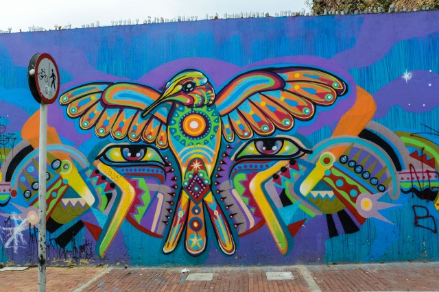 The first day, a Sunday, we spent 4 hours on a bike tour, hosted by Mike, an old American expat who has lived in Colombia for 12 years. Along with about 20 others we visited a market where we sampled at least 20 kinds fruit, many of them hybrid crosses. We cycled the somewhat quieter streets with hundreds of others. On Sundays in Bogota Ciclovia brings many out on their bicycles to enjoy the city’s attractions. We watched dancers and a kind of martial arts in the park. We went to a coffee roaster. We stopped at many street art locations. We rode through the red light district, didn’t partake though. We drank beer and played a strange game where we threw lead weights at something caps with gun powder.