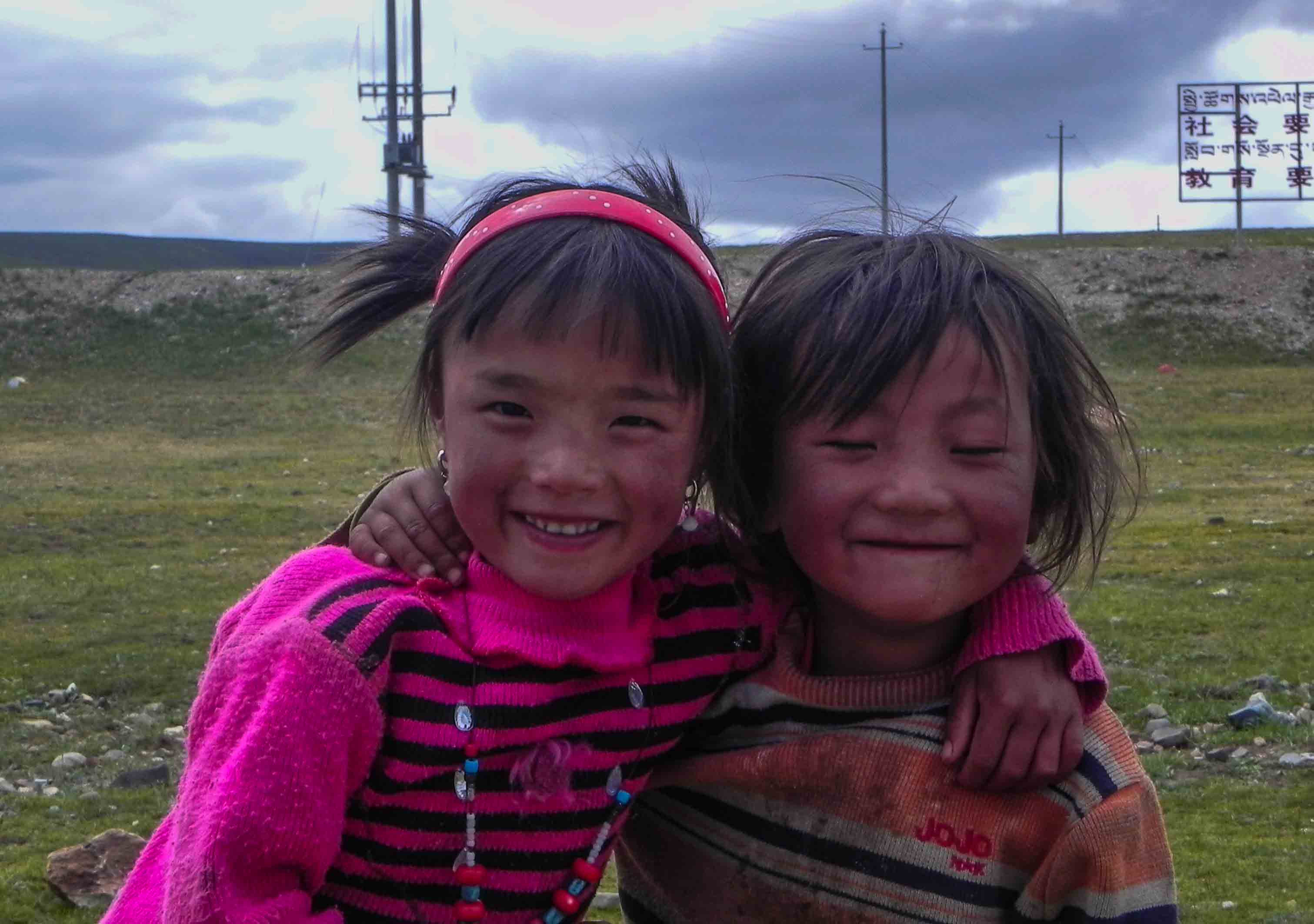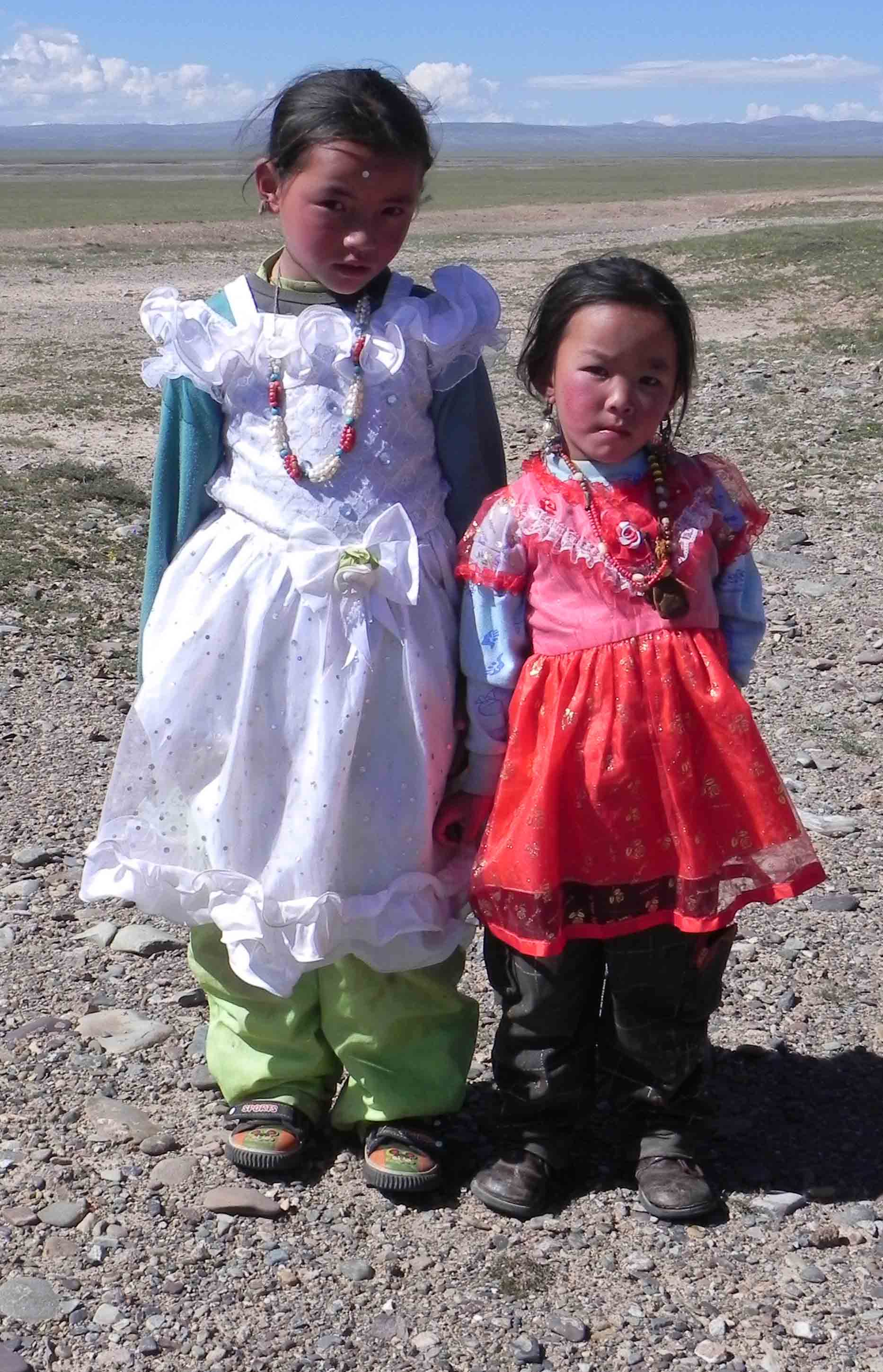 We started with a 200 m climb over 19km.  It was fairly stiff as it continued without break.  As I started last, riding with Tina for a while, I got to pass all 22 of our cycling community and 2 more who dropped into the mix from somewhere. Over the top, I stopped couple of times for  pictures, where I was caught by the blue sweater girl, from the fast group. We then had a long lovely 40 km run during which time I gazed at the views and day dreamed extensively.  Pretty Drokpas  (Nomads)When I saw a colourful group standing by the roadside I stopped for chocolate, which I shared with two lovely little girls.  This sharing bought me pictures of the whole family who were later identified for me as drokpas (nomads). They were all dressed in what looked like their special clothes standing by a pretty nice looking truck.  About 10 km further down the road a large gathering of people and many tents drew me in off the road.  This was to be the Tibetan Horse race we had been hearing aboutr a few days, and the little family up the road were the starters.