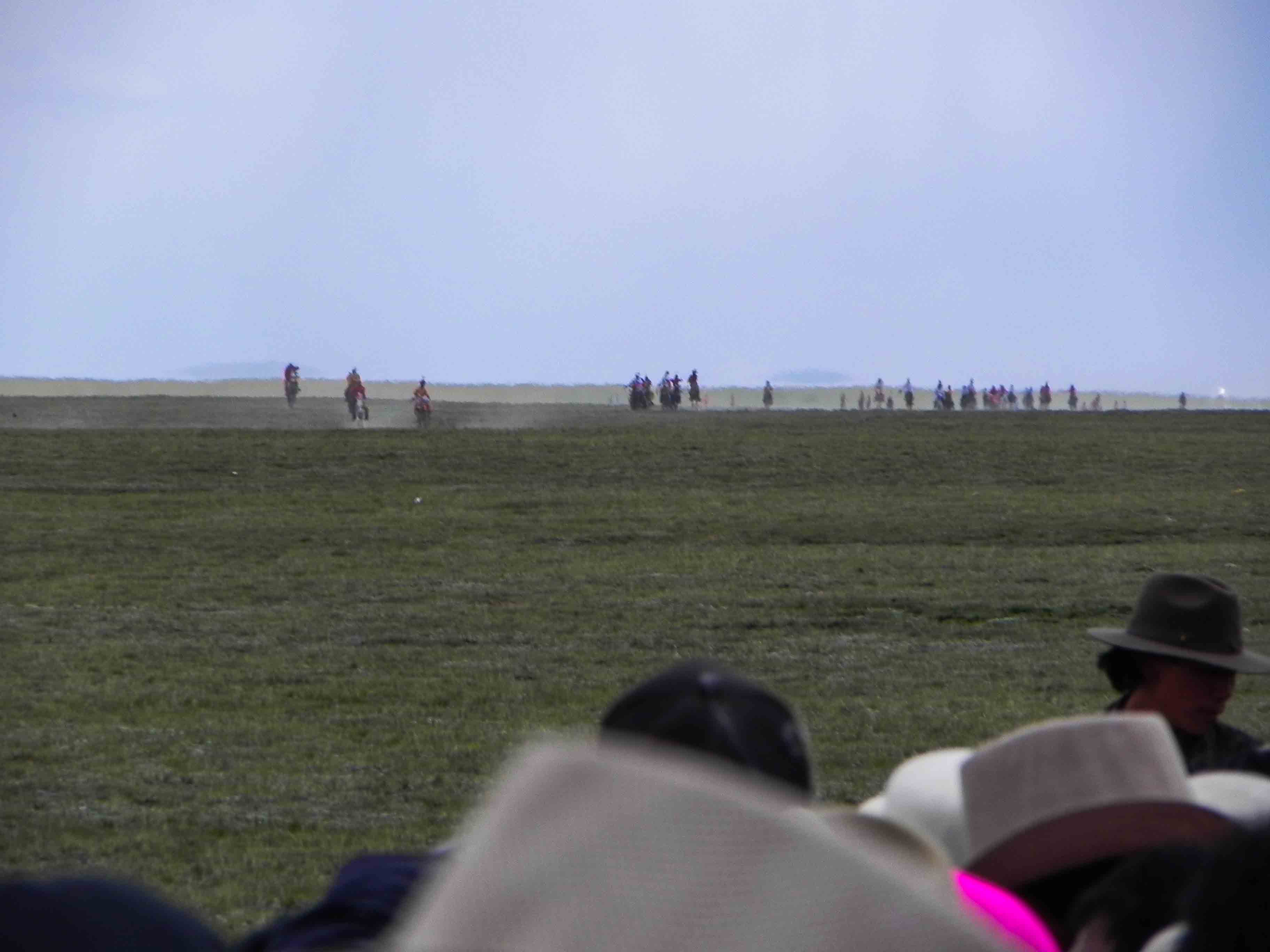 The Racers - about 10 kmsFinally, we saw a cloud of dust in the distance out of which horse and riders appeared.  As they entered the final 200 m, it was down to two, and the winner won by less than half a length.  In all about 30 came in, spread out by 5 minutes or more.  Immediately everyone rushed into the finish area and the horse and riders were paraded around and people were throwing their hadas (a long white silk scarf) over the horses’ necks.  The winner of course got most of the attention.